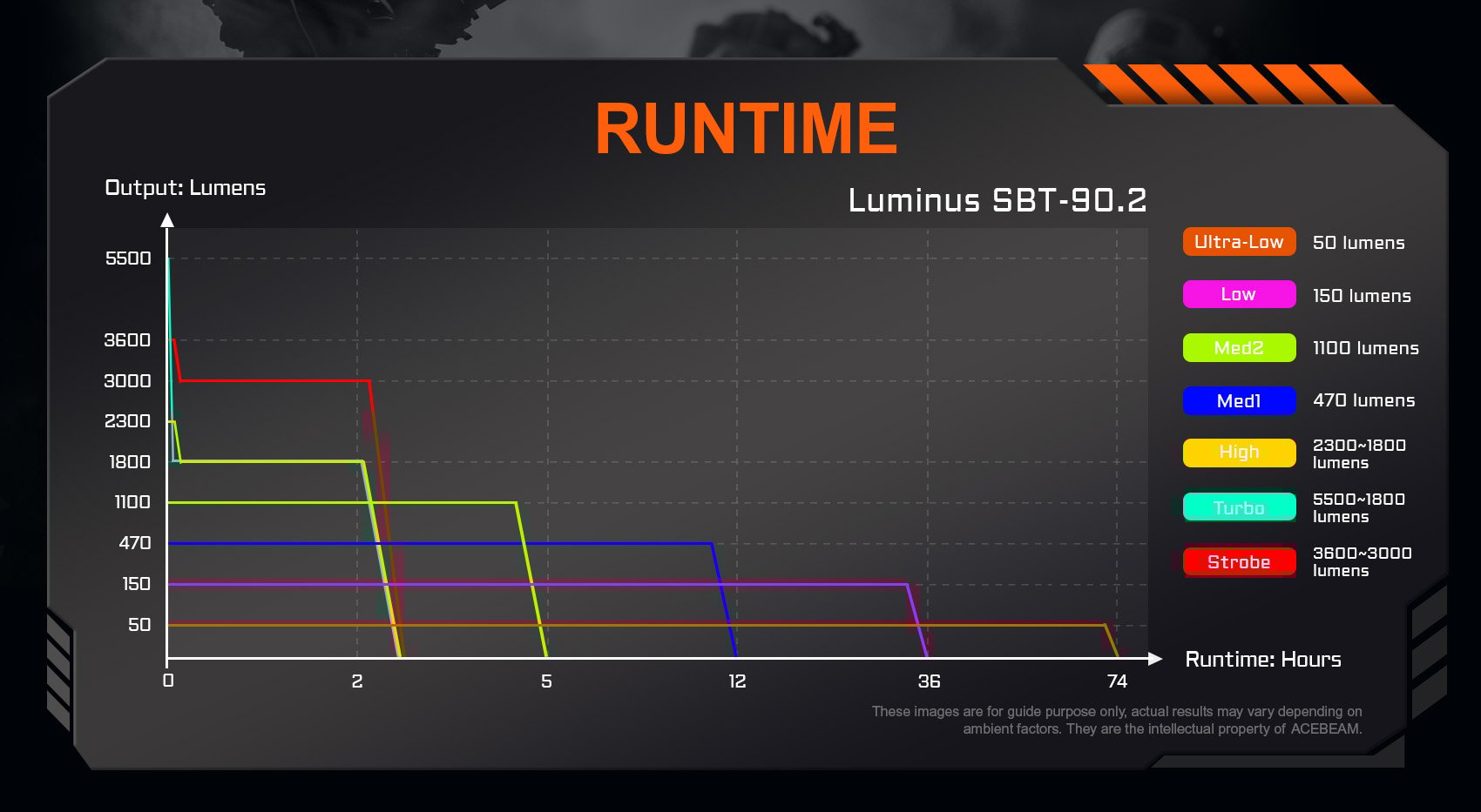 • Turbo: 5600 → 1800 lm; 1454 m; 70 δευτ. + 2 ώρες 40 λεπτά
