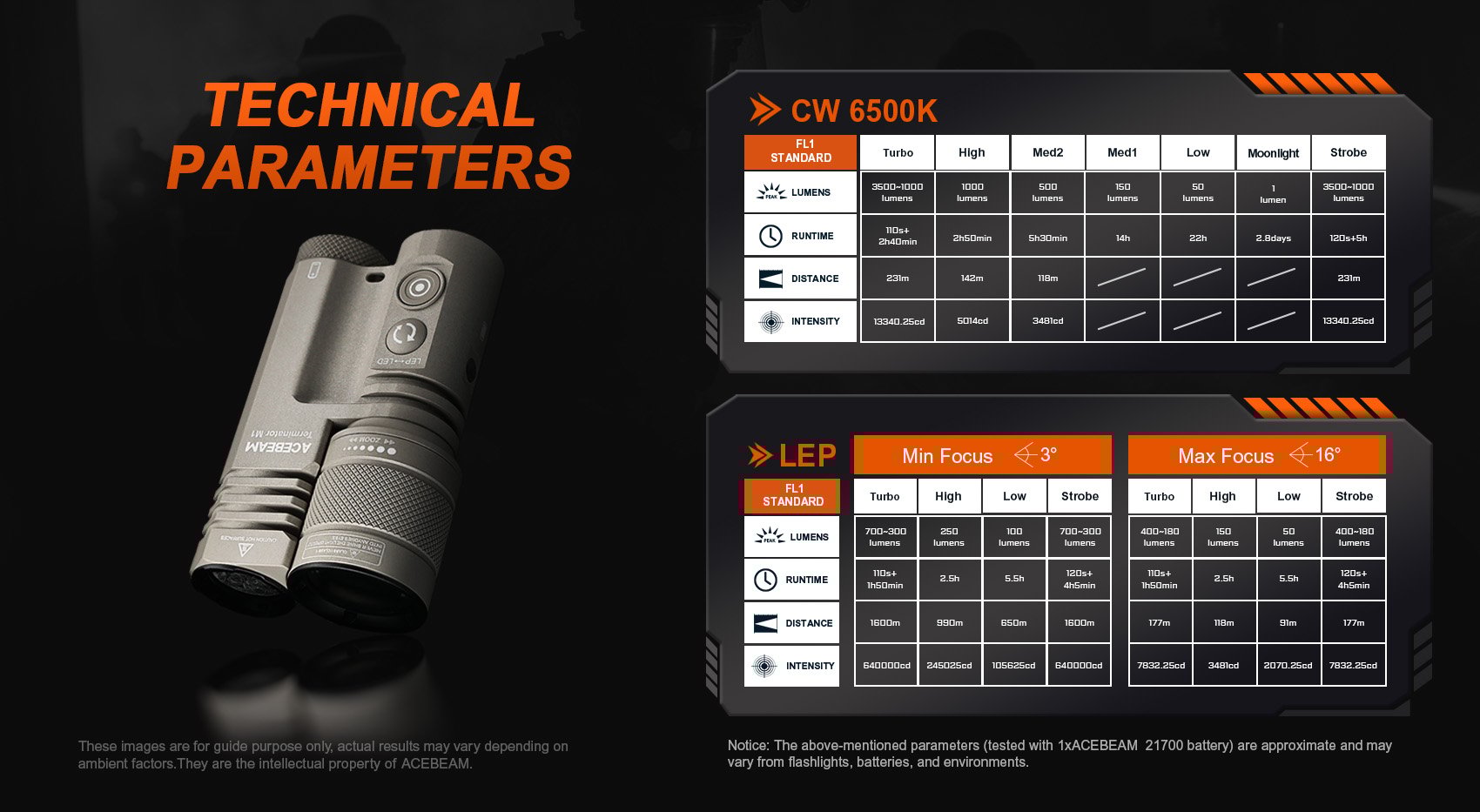 • Turbo: 3500 → 1000 lumens — 13340.25 cd — 231 m — 110 δευτ. + 2 ώρες 40 λεπτά