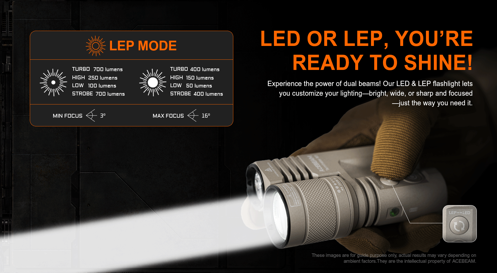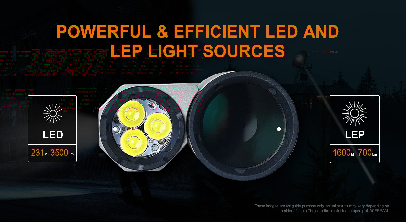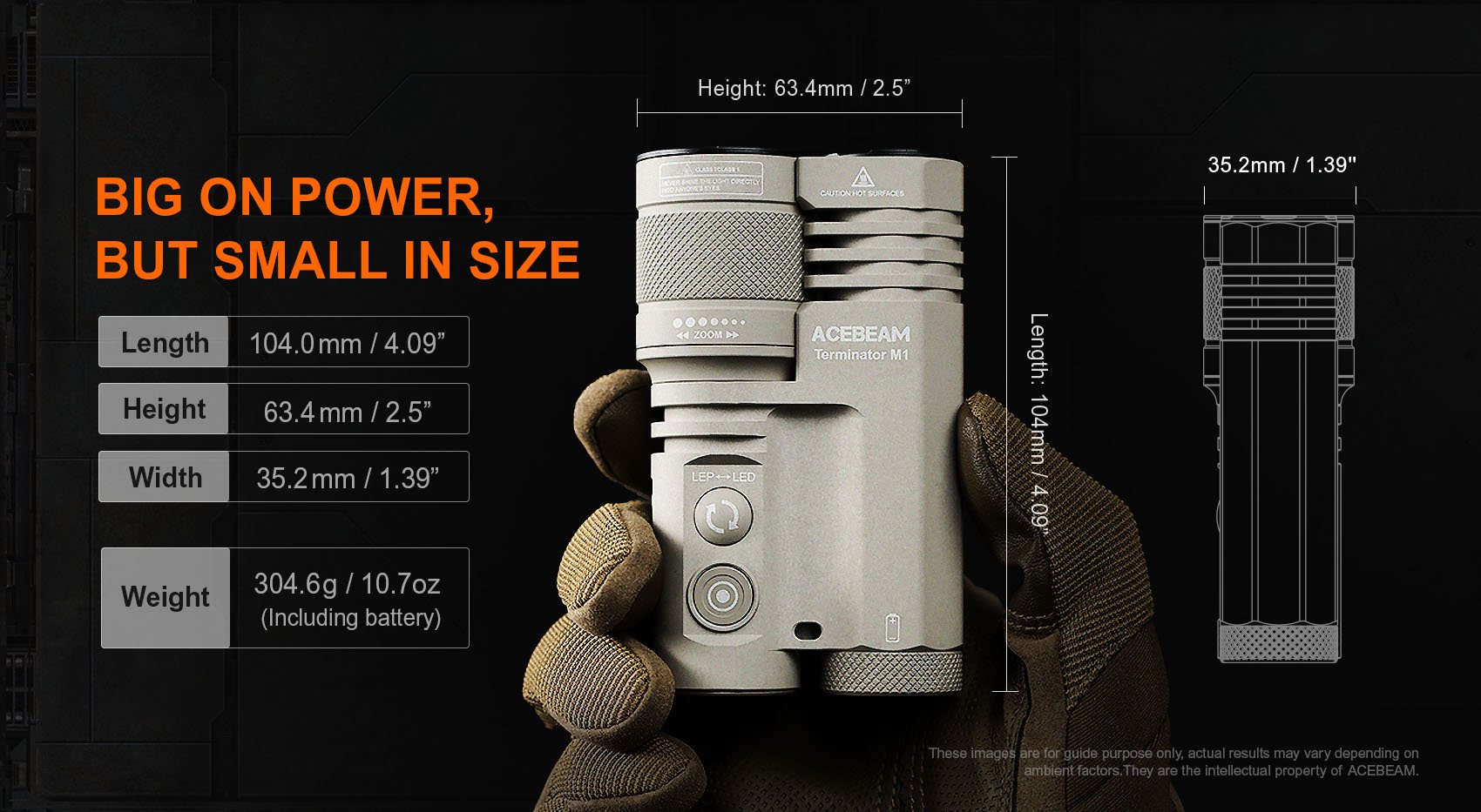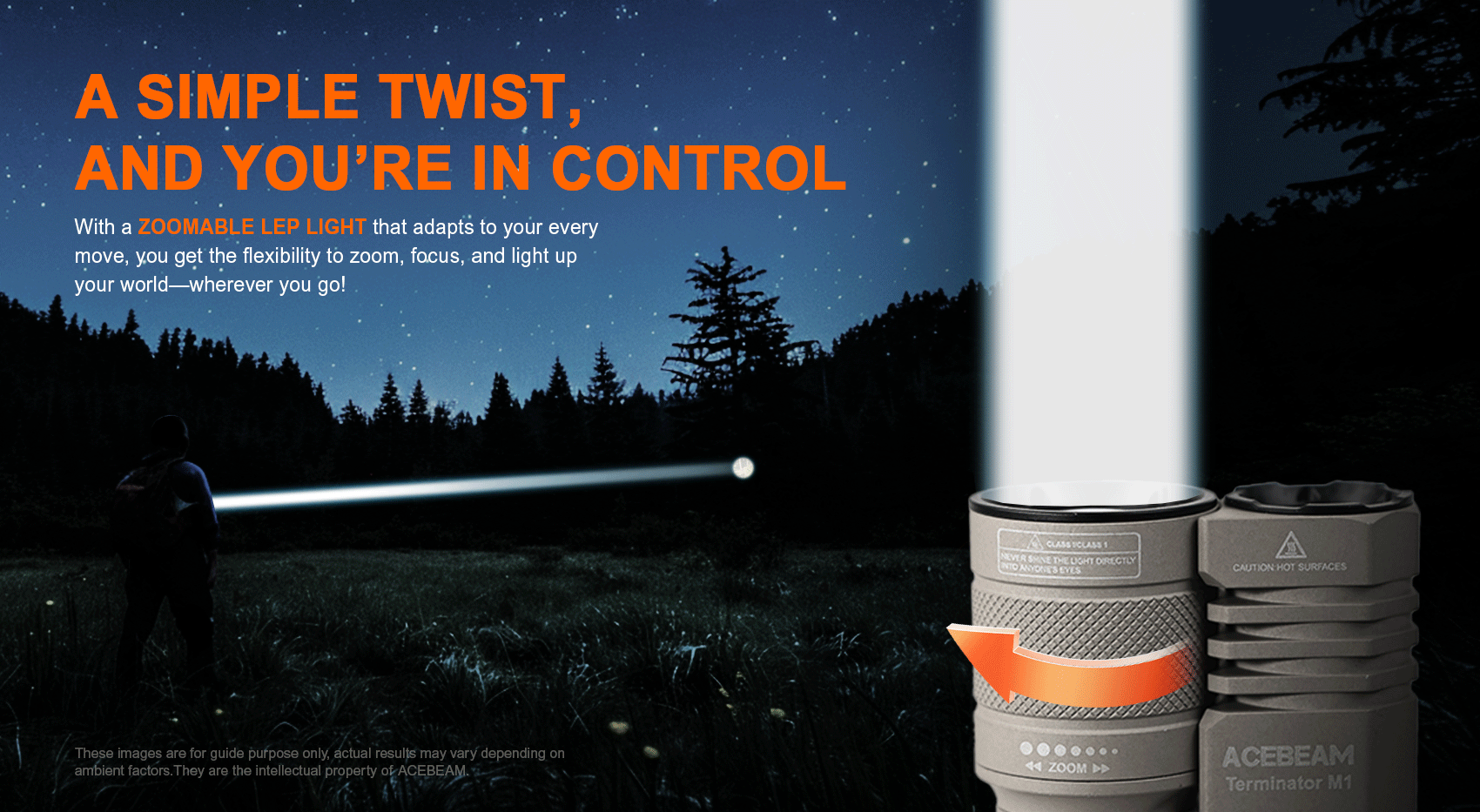 Ο ACEBEAM Terminator M1 έρχεται για να αλλάξει τον τρόπο που βλέπεις τους φακούς. Συνδυάζοντας τις τεχνολογίες LEP και LED, προσφέρει πολύ μεγαλύτερη ευελιξία από έναν φακό με μία μόνο πηγή φωτός. Ο LED προβολέας (floodlight) των 3.500 lumens φωτίζει πλατιά και έντονα τον χώρο μπροστά σου. Ο LEP προβολέας (spotlight) των 1.600 μέτρων προσφέρει απίστευτη ακρίβεια, επιτρέποντάς σου να εστιάζεις σε μακρινούς στόχους με σχεδόν «laser» ακρίβεια. Επιπλέον, ο LEP προβολέας διαθέτει δυνατότητα ζουμ, ώστε να προσαρμόζεις εύκολα τη δέσμη από μακρινή - συγκεντρωμένη, σε πιο πλατιά για φωτισμό μεγαλύτερων περιοχών.