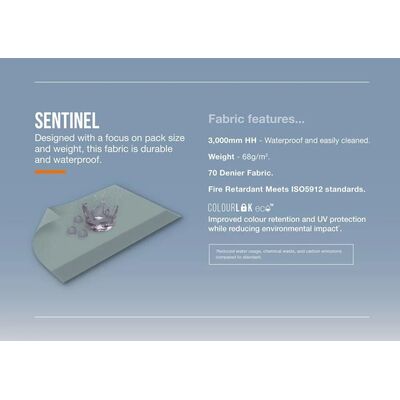 - Ύφασμα Sentinel - Όταν το μέγεθος της συσκευασίας και το βάρος είναι βασικοί παράγοντες για την επιλογή της σκηνής σας, το ειδικά σχεδιασμένο ύφασμα Sentinel θα ξεπεράσει τις επιθυμίες σας. Το Sentinel Fabric είναι ισχυρό και ανθεκτικό, ενσωματώνει την τεχνολογία ColourLok της Vango για αντοχή στον χρόνο και με αδιάβροχοποίηση 3.000 mm, εξασφαλίζει εξαιρετική ποιότητα και απόδοση σε συνδυασμό με το συμπαγές μεγέθος συσκευασίας της.