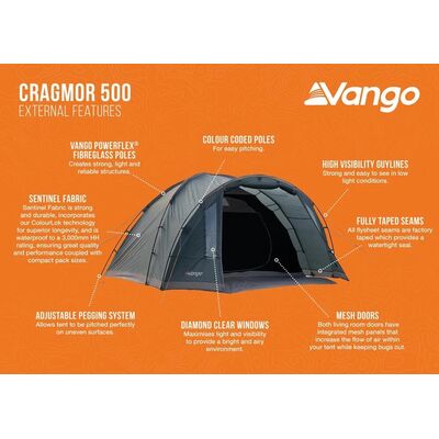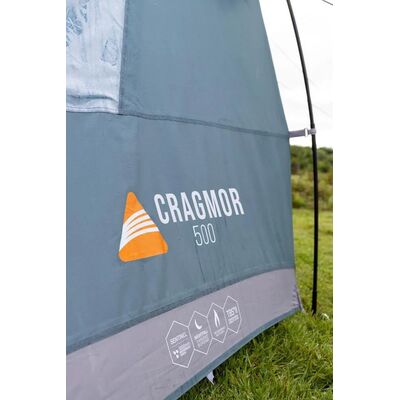 Η Cragmor 500 είναι μια σκηνή θόλου 5 ατόμων, με τρεις μπανέλες, η οποία διαθέτει μια μεγάλη σκεπαστή βεράντα με δάπεδο που είναι τέλεια για την αποθήκευση του εξοπλισμού ή για την προστασία σας από τα καιρικά στοιχεία. Η κρεβατοκάμαρα διαθέτει ύφασμα Lights-Out® το οποίο έχει σχεδιαστεί για να εμποδίζει το φως να εισέλθει στην σκηνή νωρίς το πρωί και να σας ξυπνήσει. Η σκηνή Cragmor είναι μια ευέλικτη σκηνή που είναι ιδανική για μικρές οικογένειες, ζευγάρια και φίλους για τις κατασκηνώσεις το Σαββατοκύριακο ή το φεστιβάλ.